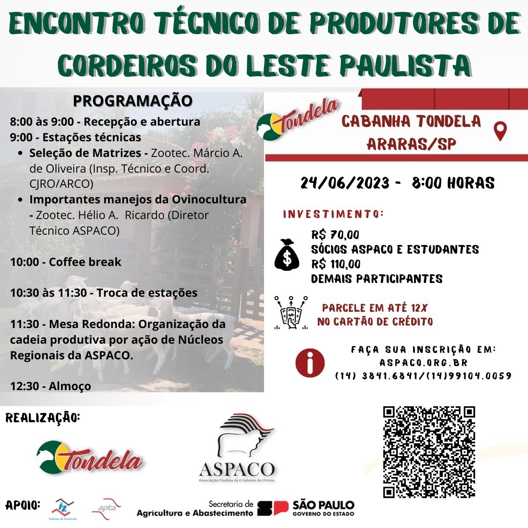 O Instituto de Zootecnia (IZ-APTA), da Secretaria de Agricultura e Abastecimento do Estado de SP, em parceria com a ASPACO, realizará no mês de junho o evento ENCONTRO DE PRODUTORES DE CORDEIROS DO LESTE PAULISTA, em Araras/SP.