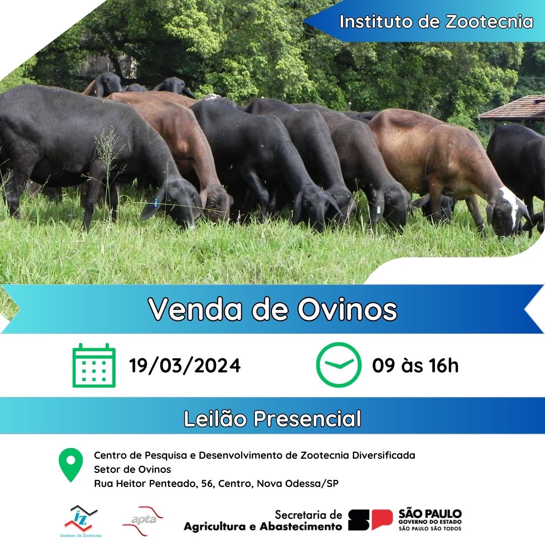 O Instituto de Zootecnia (IZ-APTA), da Secretaria de Agricultura e Abastecimento do Estado de SP, realizará Leilão presencial de Ovinos: