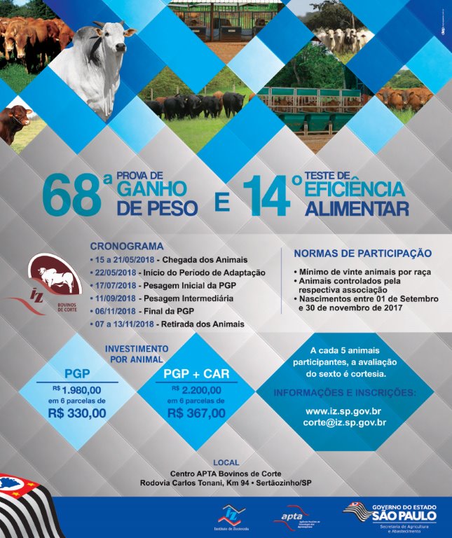 Data: 15/05 a 13/11/2018 Local: Instituto de Zootecnia - Sertãozinho (SP) - Rodovia Carlos Tonanni, km 94 Coordenação: Centro de Pesquisa em Bovinos de Corte Resumo