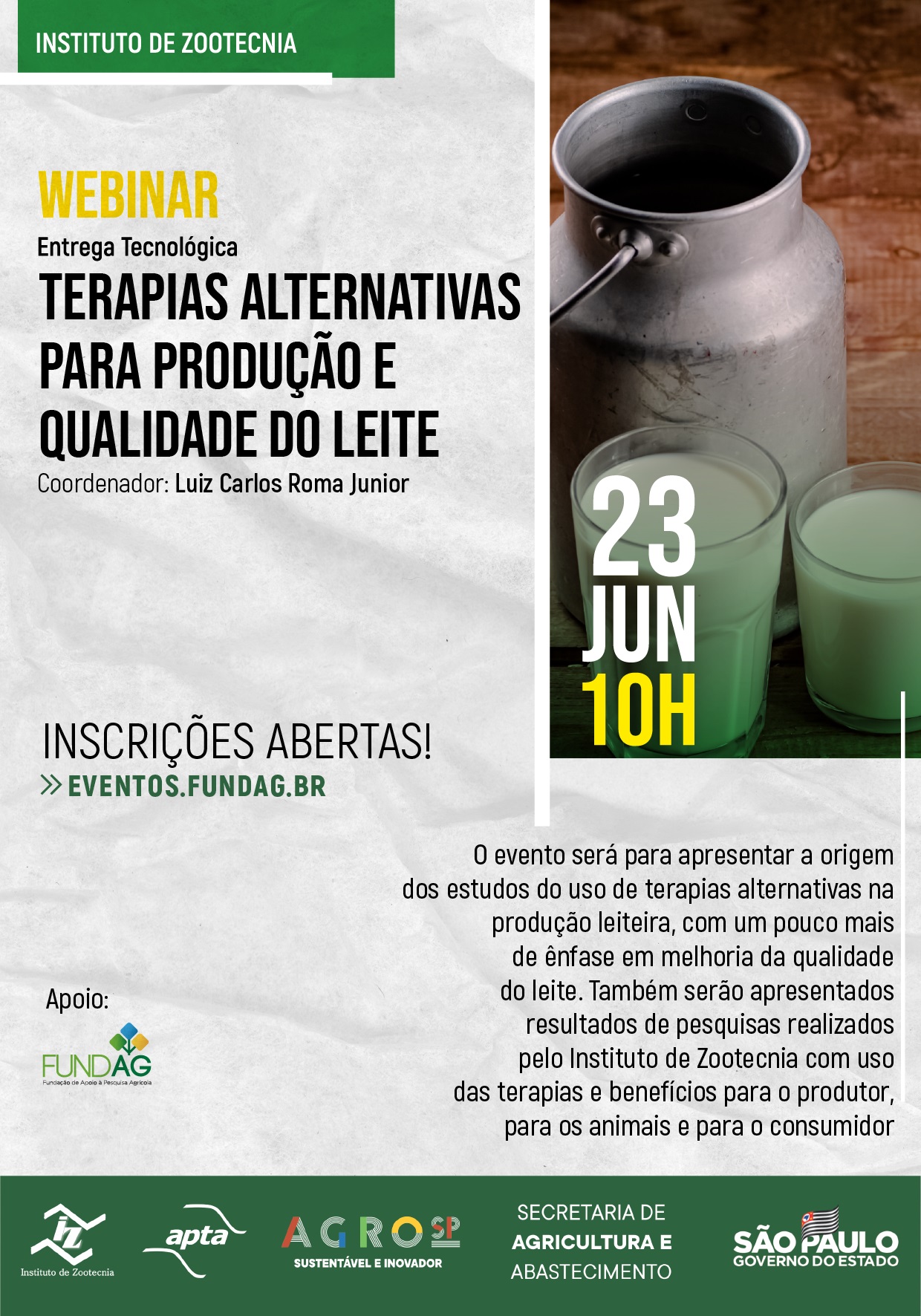 Resumo: O evento será para apresentar a origem dos estudos do uso de terapias alternativas na produção leiteira, com um pouco mais de ênfase em melhoria da qualidade do leite. Também serão apresentados resultados de pesquisas realizados pelo Instituto de Zootecnia com uso das terapias e benefícios para o produtor, para os animais e para o consumidor.
