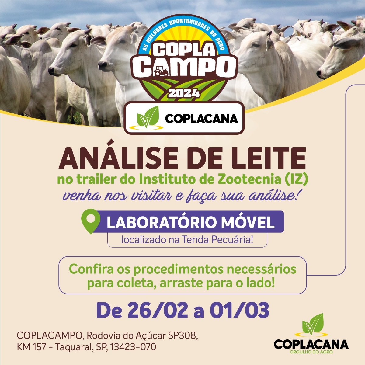 O Instituto de Zootecnia (IZ-APTA), da Secretaria de Agricultura e Abastecimento do Estado de SP, de 26/02 à 01/03, estará presente, na Tenda Pecuária no evento Coplacampo, em Piracicaba/SP.