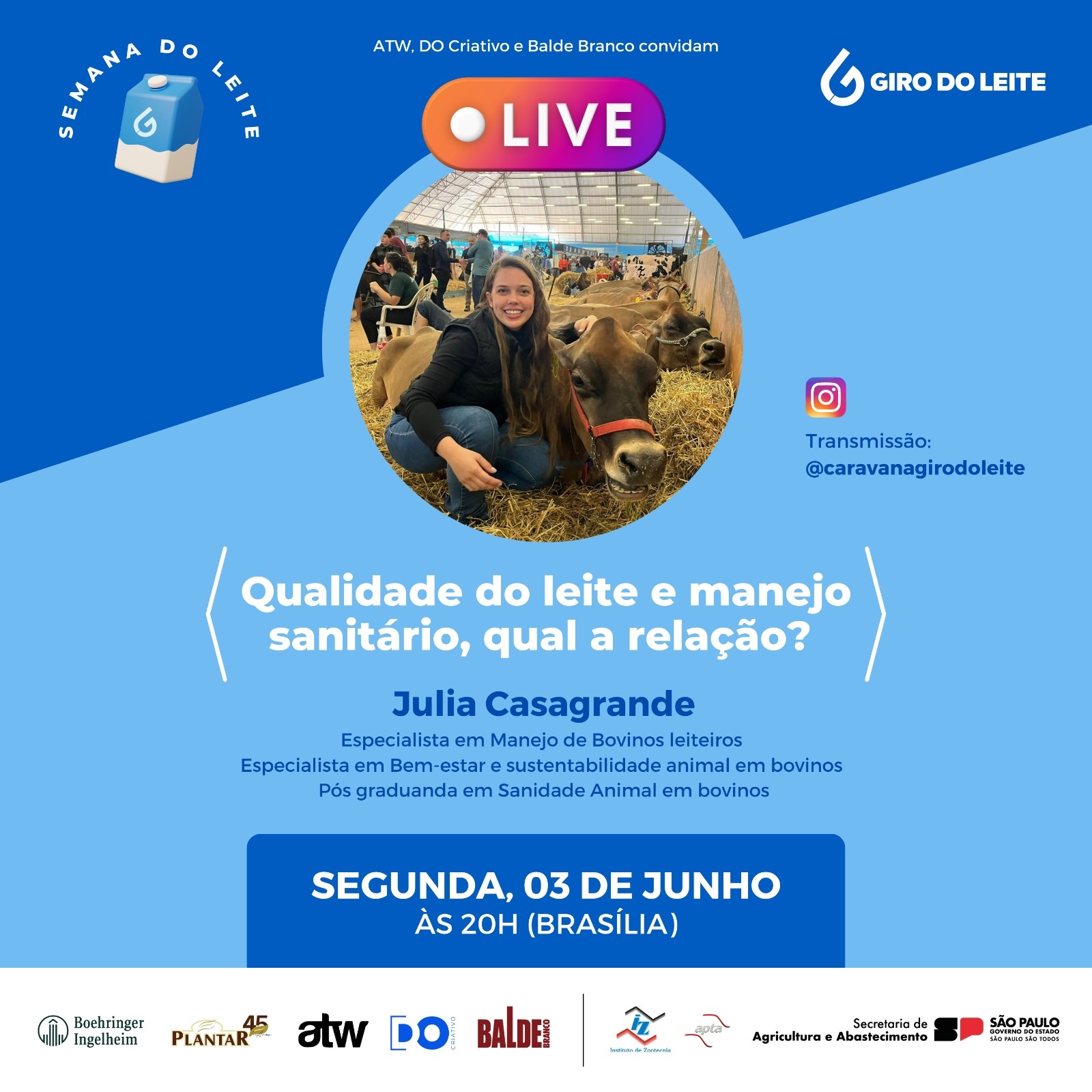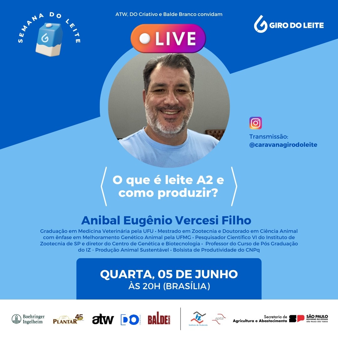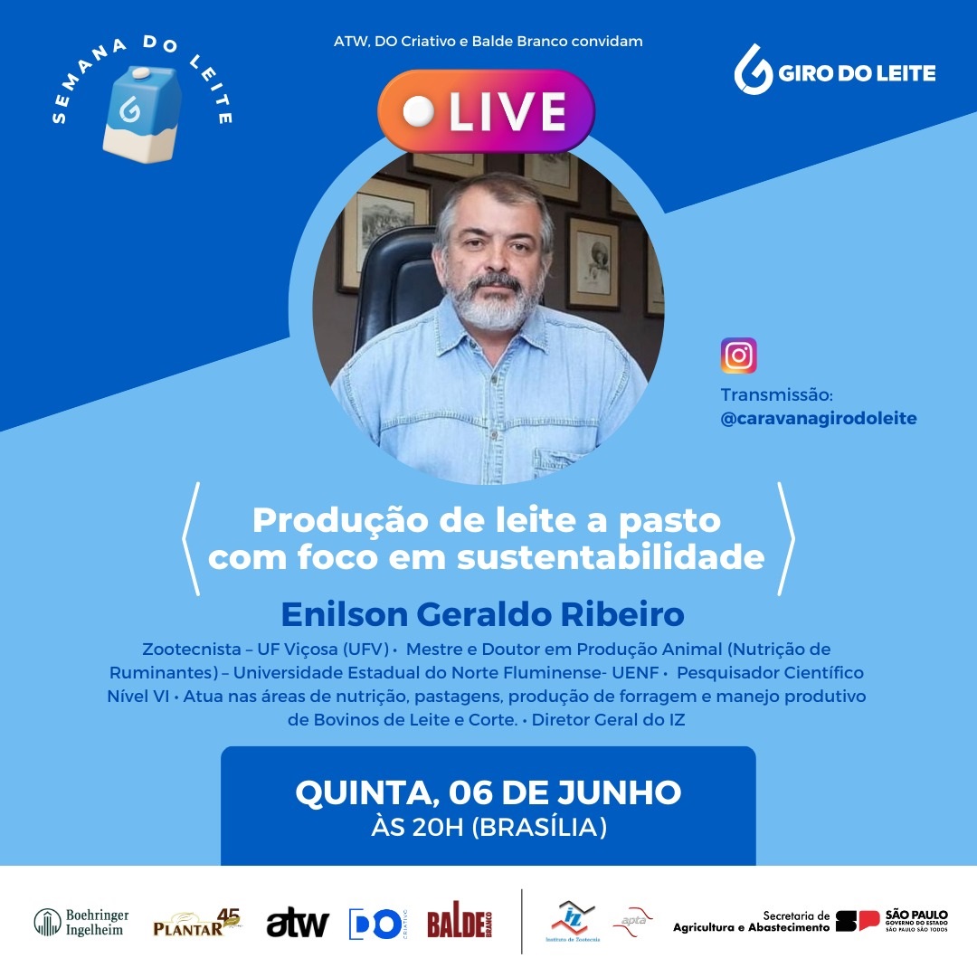 O Instituto de Zootecnia (IZ-APTA), da Secretaria de Agricultura e Abastecimento do Estado de SP, em parceria com a Caravana Giro do Leite, Balde Branco e ATW, comemoram a Semana do Leite com palestras em formato de Live, às 20h, no Instagram:
