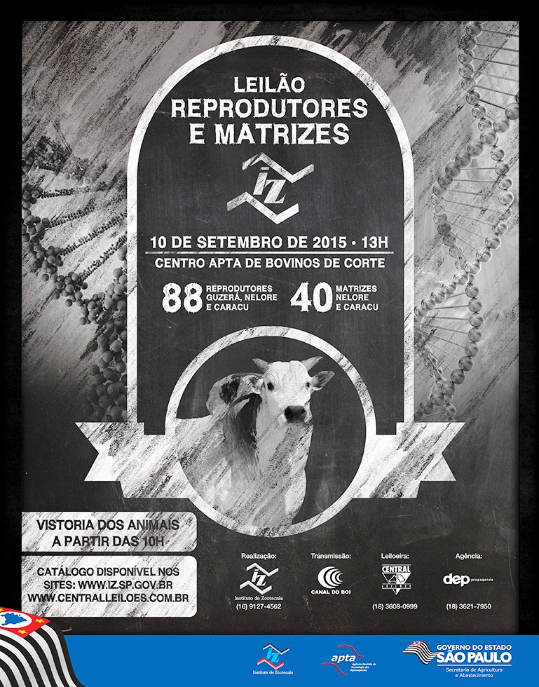 Disponível o pré-catálogo com as informações dos bovinos que serão disponibilizados para a venda no leilão de reprodutores e matrizes, no dia 10 de setembro, às 13 horas, no Centro de Pesquisa em Bovinos de Corte do Instituto de Zootecnia (IZ), em Sertãozinho (SP). A vistoria dos animais é a partir das 10 horas.