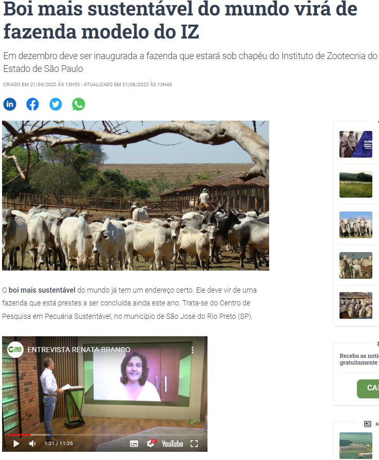 Pesquisadora do IZ-APTA, da Secretaria de Agricultura e Abastecimento do Estado de SP, Dra Renata Branco, em entrevista no Canal Rural, ao programa Giro do Boi, fala de Pecuária Sustentável no novo Centro de Pesquisa [fazenda modelo], em São José do Rio Preto (SP).